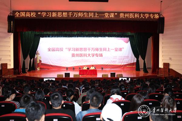 6月14日,全国高校“学习新思想千万师生同上一堂课”贵州医科大学专场在南校区礼堂举行。此次活动由教育部主办,中共贵州省委教育工委、贵州省教育厅承办,贵州医科大学、贵州民族大学人文科技学院协办。 “贵州省高等学校习近平总书记重要讲话精神集中讲师团”授课专家,我校党委书记林昌虎、校长何志旭主讲,校党委副书记、附属医院党委书记刘兴德,副校长罗鹏,贵州省中国科学院天然产物化学重点实验室(贵州医科大学天然产物化学重点实验室)副主任傅舒安出席,来自我校及贵州民族大学人文科技学院的1375名师生代表参加。活动由校党委副书记吕保平主持。