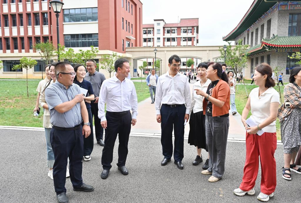 校领导一行到迎新现场,通过查看报到台账、与工作人员交流、和新生互动等方式,详细了解新生报到流程、报到进度,宿舍安排及服务保障工作落实情况。
