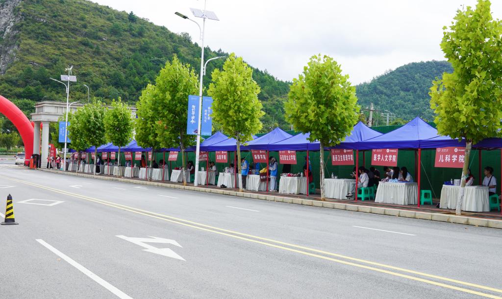 作为主迎新场地,云漫湖校区划分四大区域,设置20余个学院迎新帐篷。各站点配备志愿者引导新生完成行李寄存、信息核验等流程,并发放《新生服务手册》、校园地图等实用资料。现场设立“一站式”服务台,提供保险购买、助学贷款咨询、户籍迁移等服务,同时开辟绿色通道为困难学生办理临时补助申请。