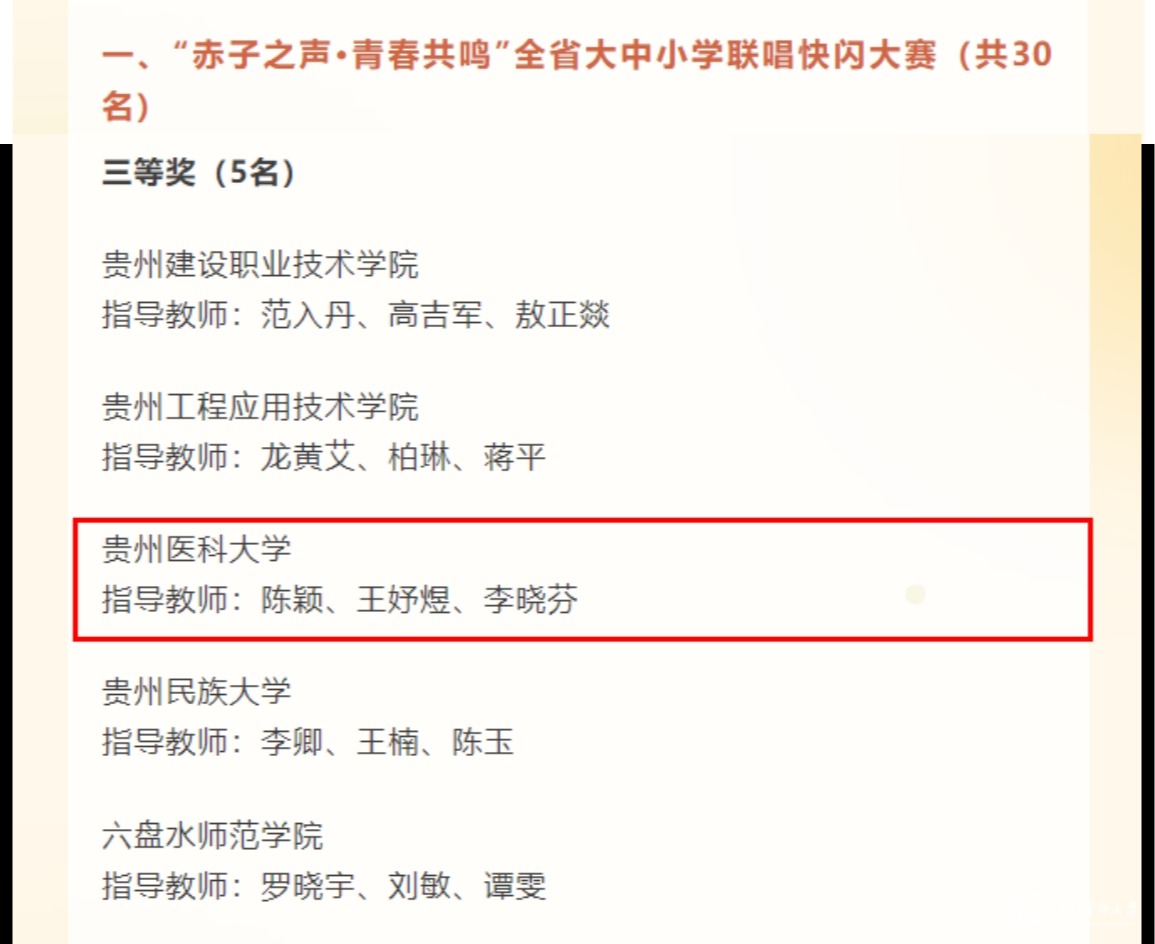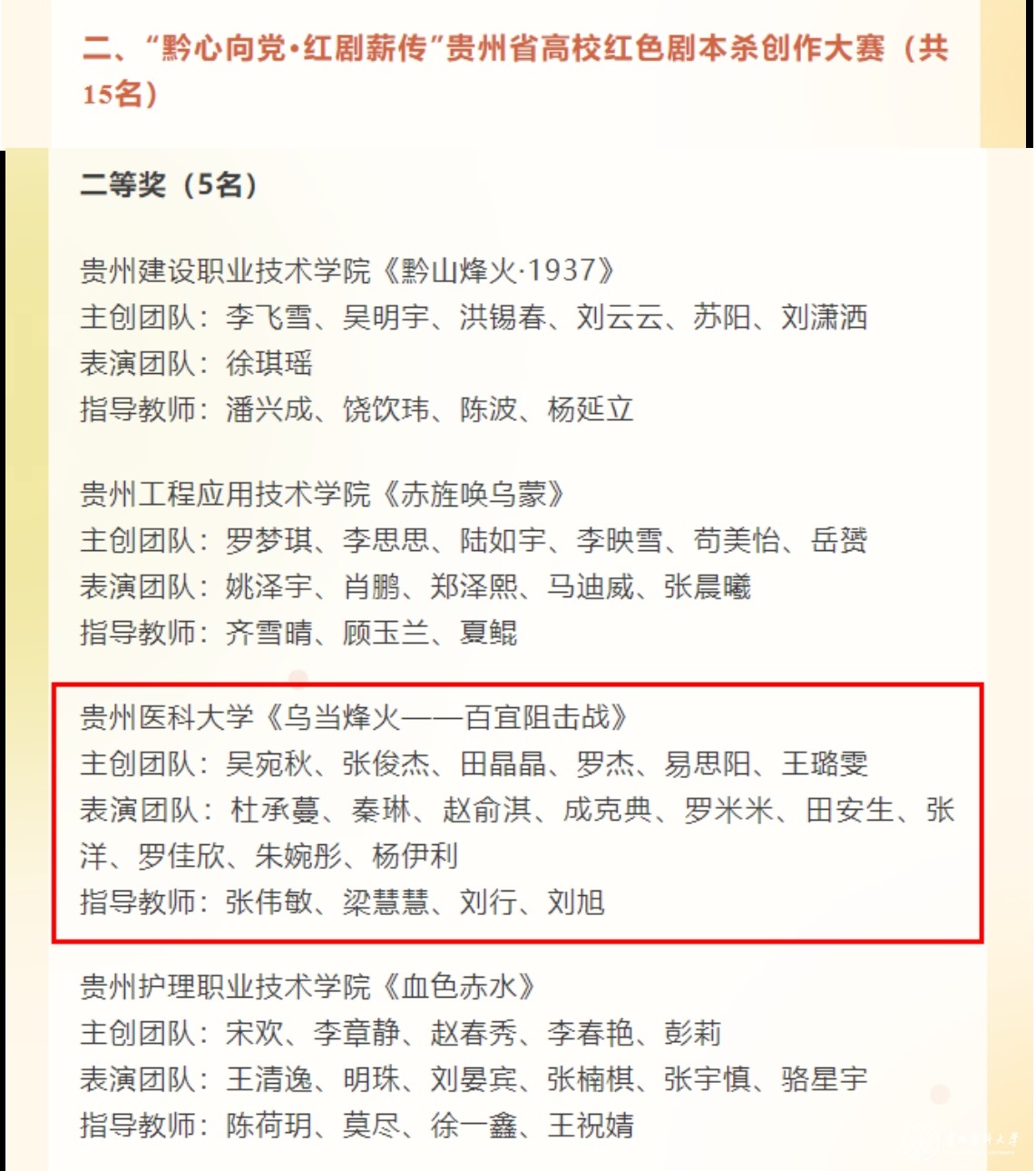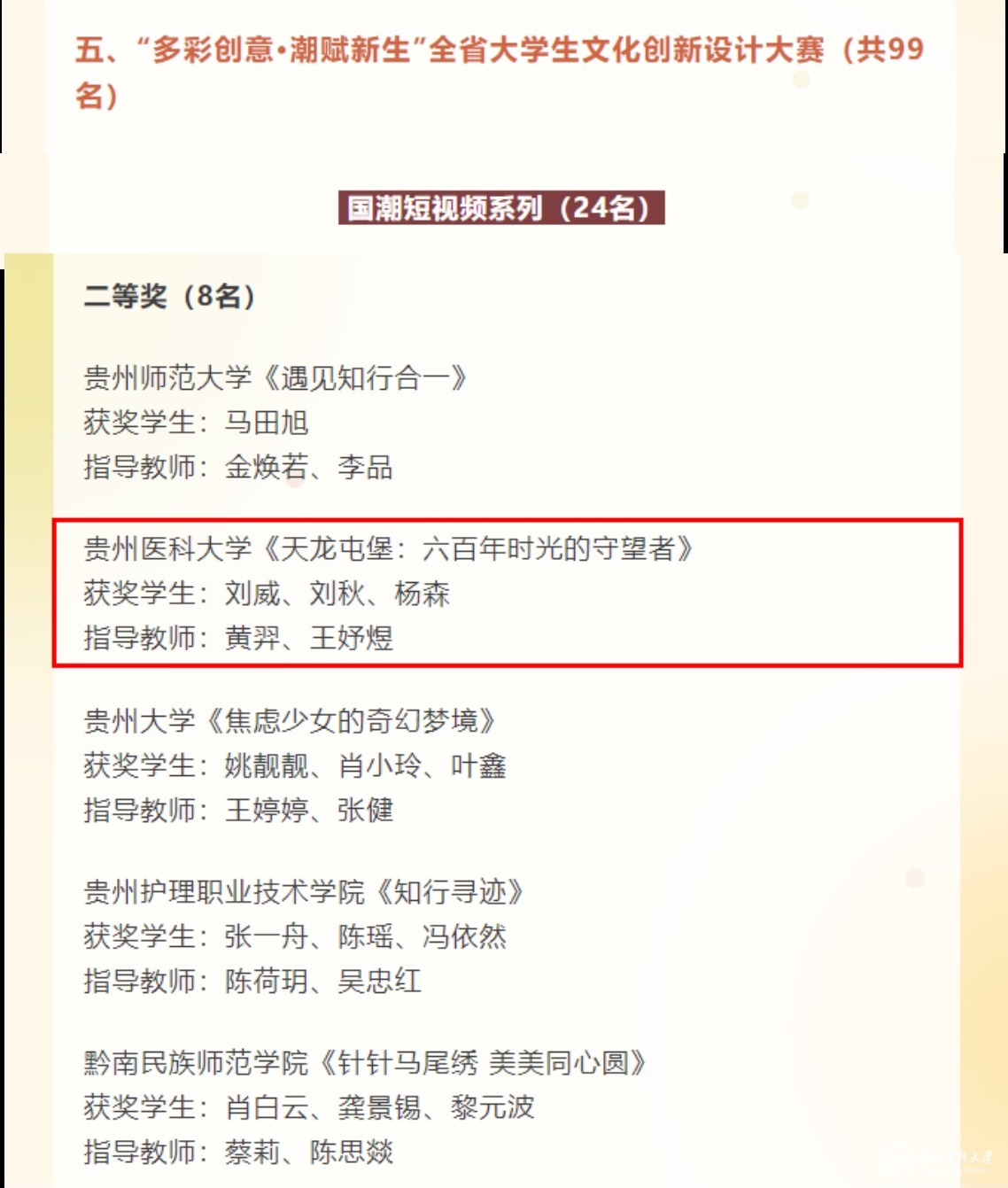我校师生在多项赛事中表现突出,共荣获省级奖项三项,分别是“黔心向党·红剧薪传”贵州省高校红色剧本杀创作大赛二等奖,“多彩创意·潮赋新生”全省大学生文化创新设计大赛国潮短视频系列二等奖,“赤子之声·青春共鸣”全省大中小学联唱快闪大赛三等奖。
